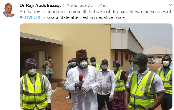 Two COVID19 patients have been discharged from the Kwara state Isolation center after testing negative to the virus twice. The State Commissioner for Health, Raji Abdulrasaq, disclosed this on Twitter today Thursday April 16.''Kwara discharges two index cases of #COVID19 after testing negative twice.'' he wrote Kwara now has two active cases of COVID-19 following the recovery of its first two cases.