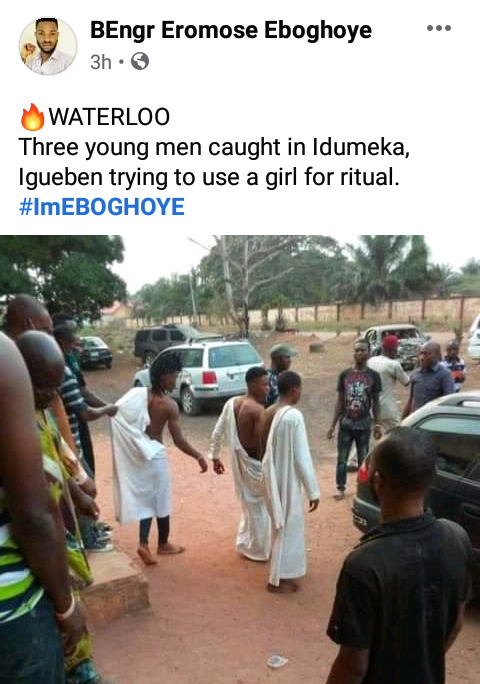 Luck ran out on three suspected ritualists in Igueben Local Government Area of Edo State after they were allegedly caught trying to use a girl for money ritual. According to a post by Igueben LG chairmanship aspirant, Eromose Eboghoye, the three 'strange' young men wearing white robes were caught in Idumeka community on Tuesday, February 2. "WATERLOO. Three strange young men caught in Idumeka, Igueben trying to use a girl for ritual" he wrote.